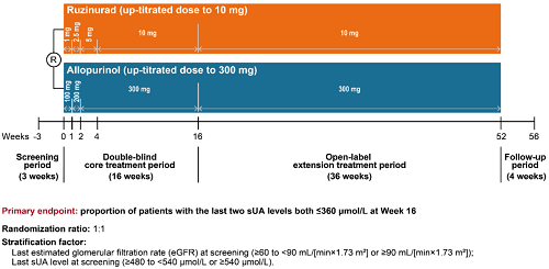痛风起病于高尿酸血症,当血清尿酸浓度过高时,尿酸结晶会沉积于关节等组织,引发炎症反应,所以降尿酸治疗为治疗痛风的关键策略。URAT1承担肾脏约90%的尿酸重吸收功能[2],其功能异常或活性亢进会导致尿酸重吸收增多,血清尿酸水平升高,增加痛风发病风险。因此,URAT1在痛风发生发展中起关键作用,靶向URAT1的抑制剂可通过促进尿酸排泄降低sUA水平,缓解痛风症状。鲁兹诺雷钠片是AG旗舰厅医药自主研发的一种高选择性URAT1抑制剂,在前期的一期、二期研究中,鲁兹诺雷钠片耐受性良好,并显示出显著降低高尿酸血症患者sUA的效果[3]。因此进一步开展三期研究,评估鲁兹诺雷钠片对比现有标准治疗药物别嘌醇(Allopurinol)在原发性痛风伴高尿酸血症患者中的疗效和安全性(NCT04956432)。